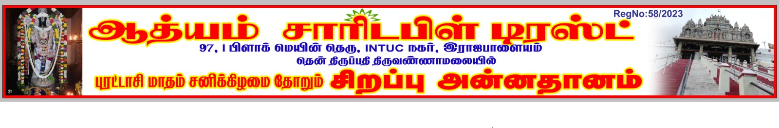 ஸ்ரீவில்லிபுத்தூர் திருவண்ணாமலை ஸ்ரீ ஸ்ரீனிவாச பெருமாள் கோவில் அடிவாரத்தில் புரட்டாசி விசேஷ நாளான சனிக்கிழமை தோறும் நமது டிரஸ்ட் சார்பாக நடைபெற்ற அன்னதானத்தில் …. முதல் சனிக்கிழமை 6000 பக்தர்களுக்கும், …